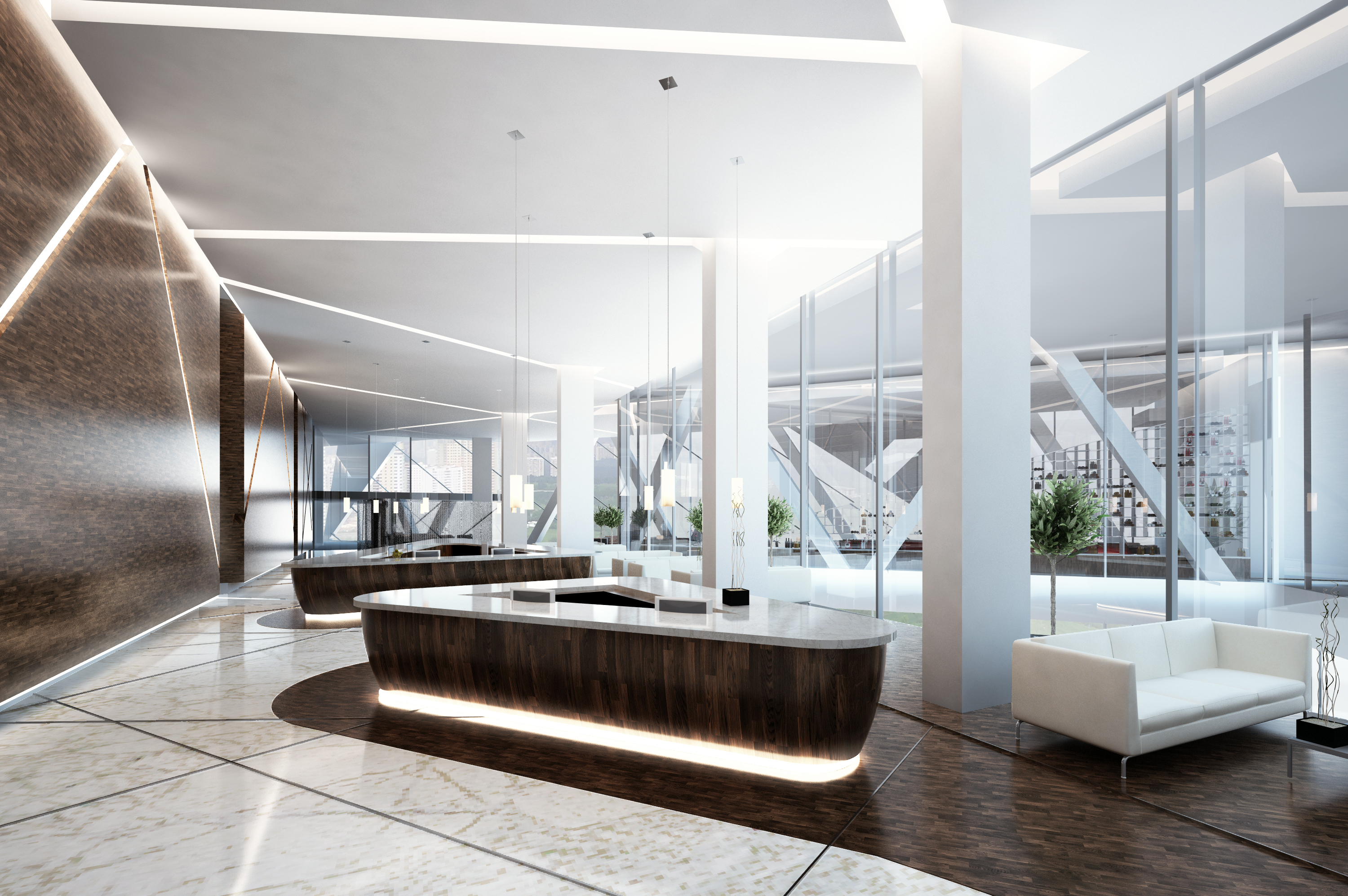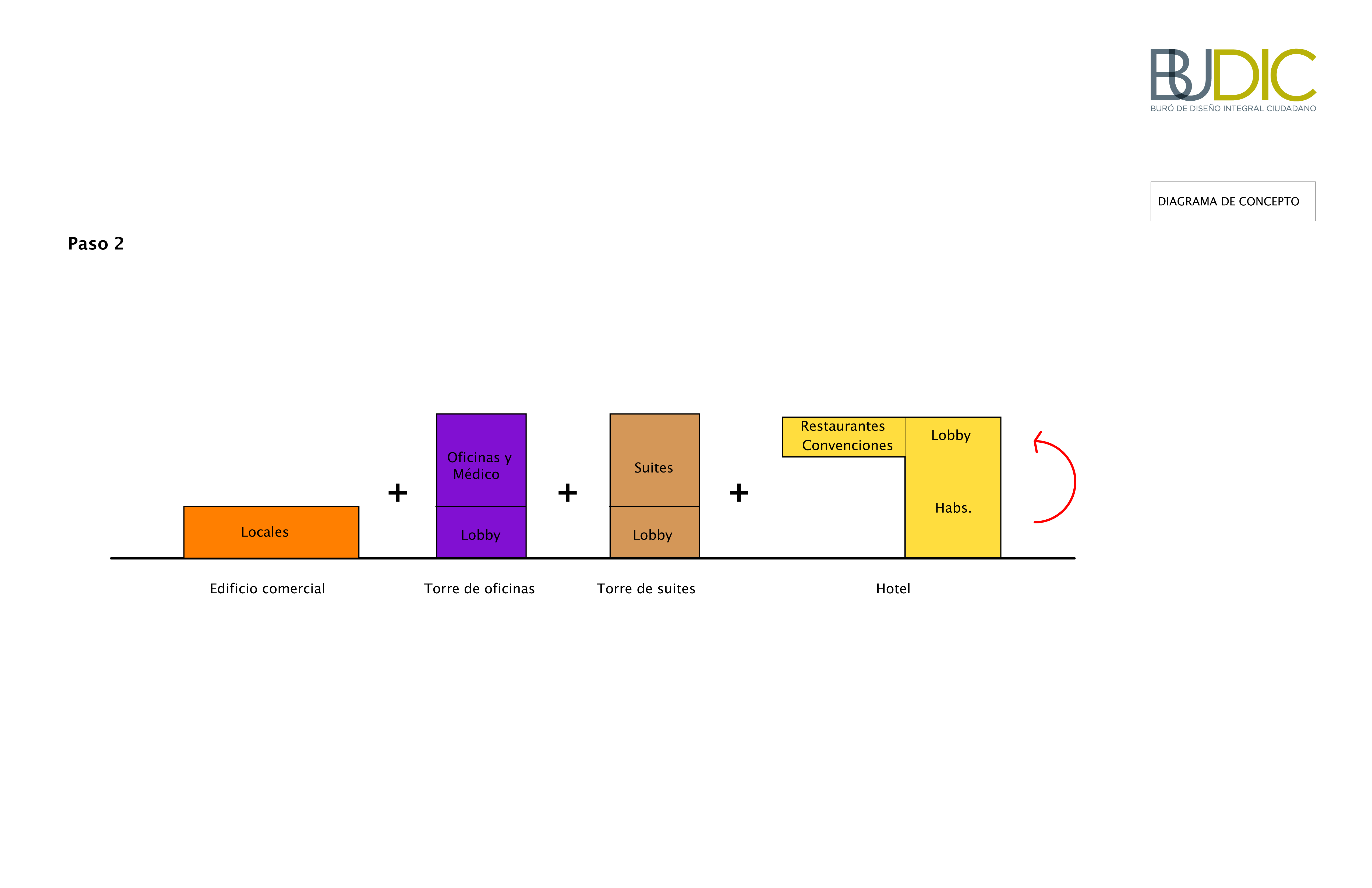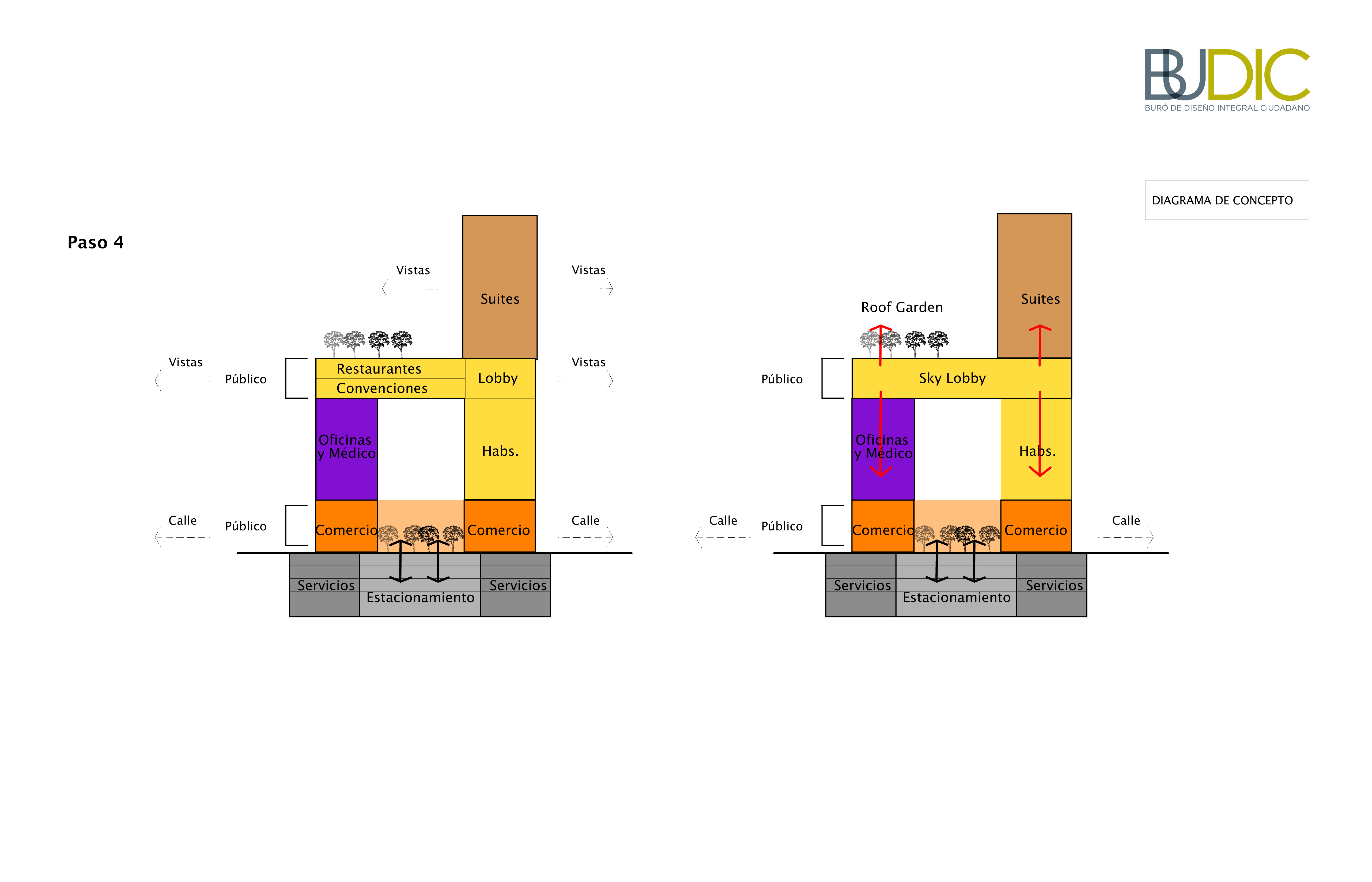 El espacio de Planta Baja aporta una plaza al entorno urbano rodeada de comercio, así como de los accesos al hotel y la parte médica. El “SkyLobby” en puente contiene todos los servicios del hotel que también son accesibles al resto del edificio. Aquí se desarrollan todas las actividades de reunión, negocios, entretenimiento y deportivas. En el piso 10 se propone un Roof Garden con alberca que tiene flexibilidad para el desarrollo de eventos.
