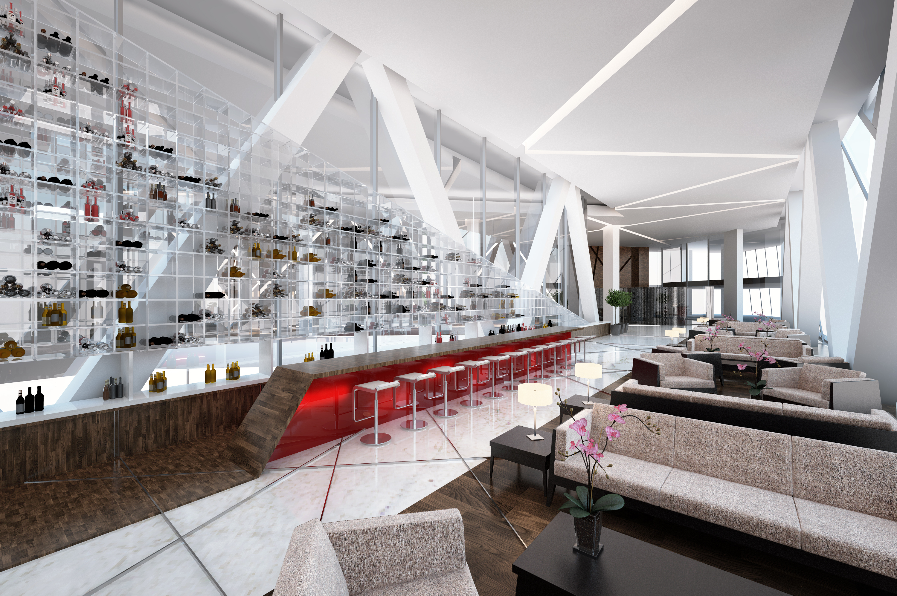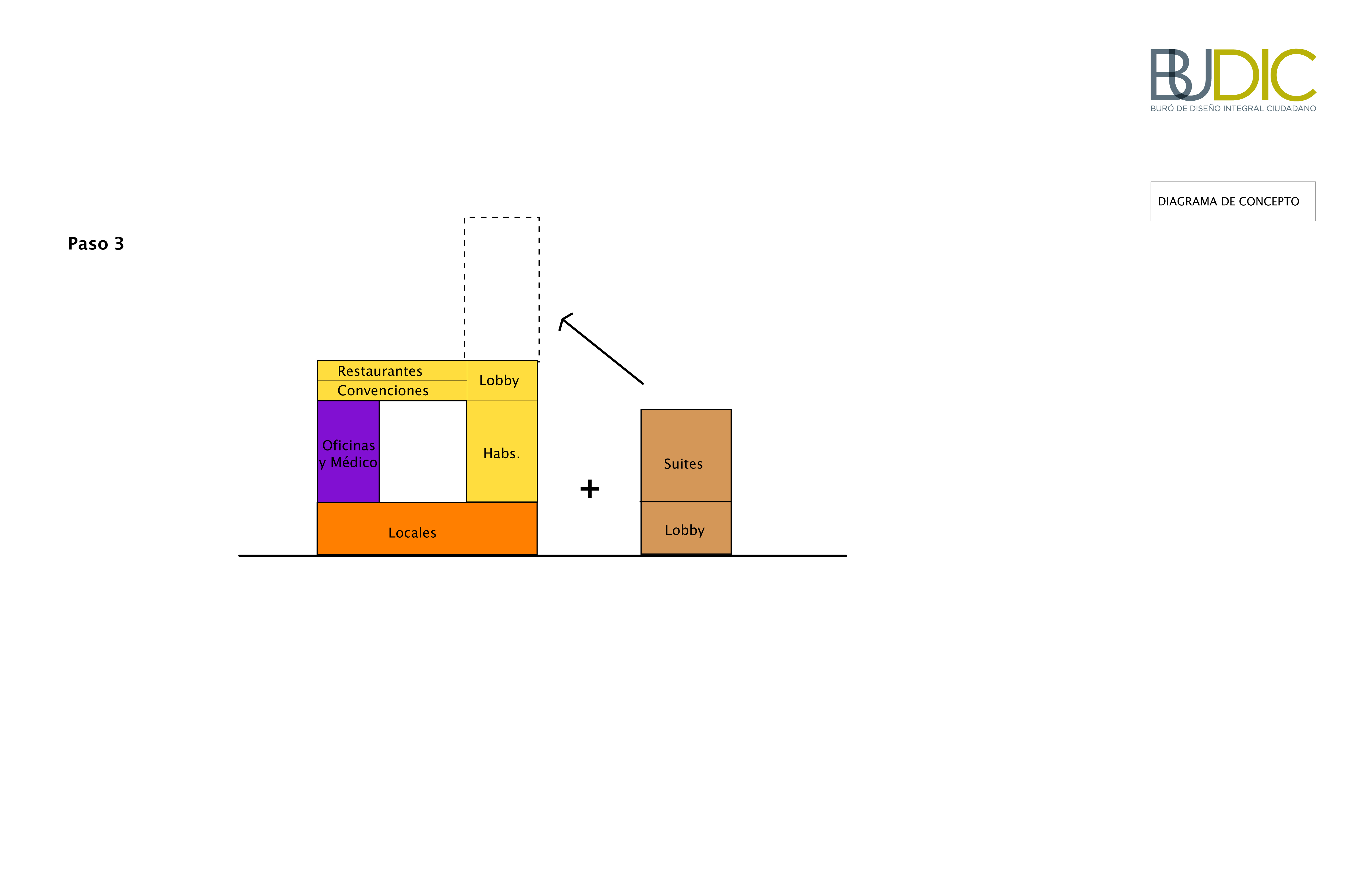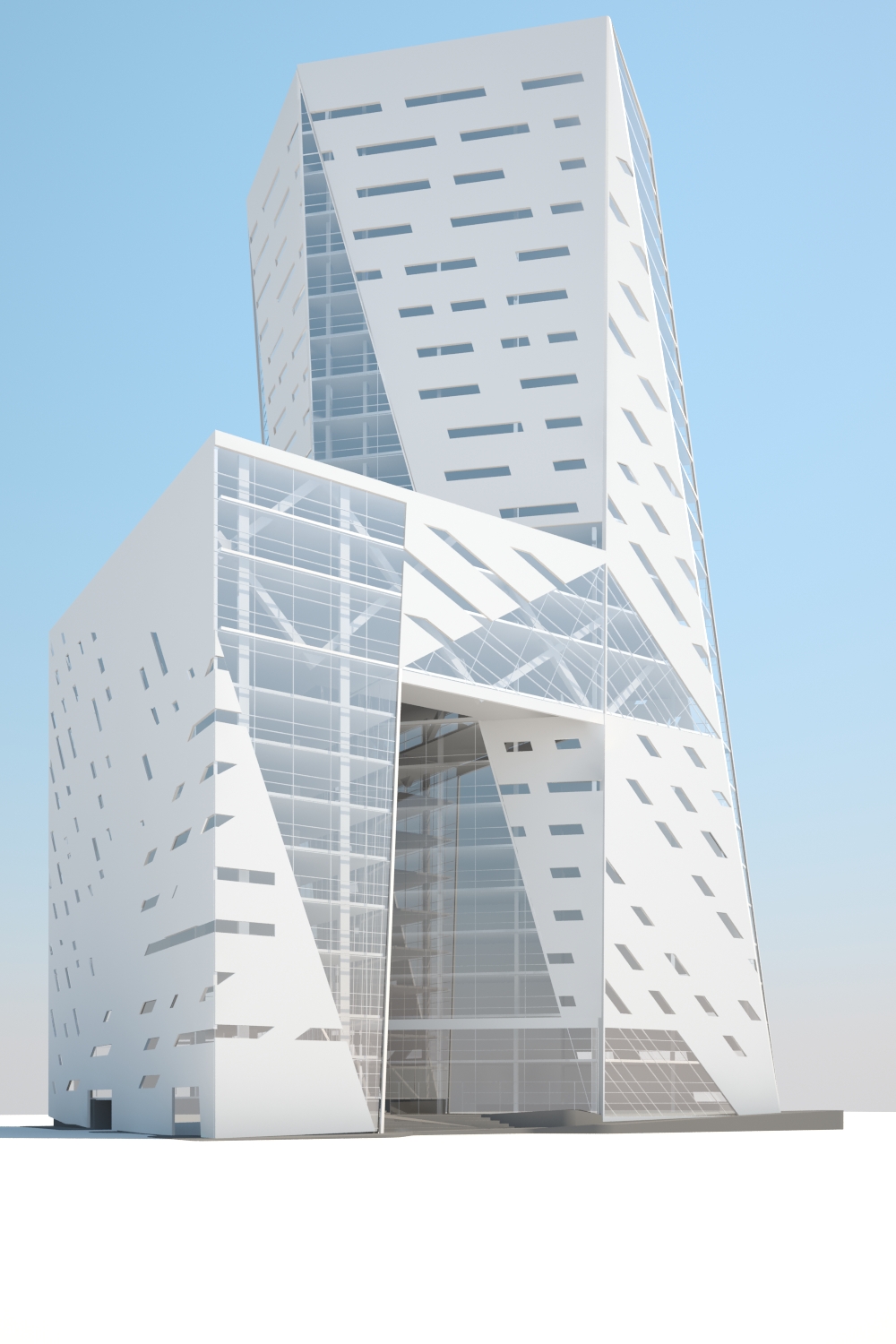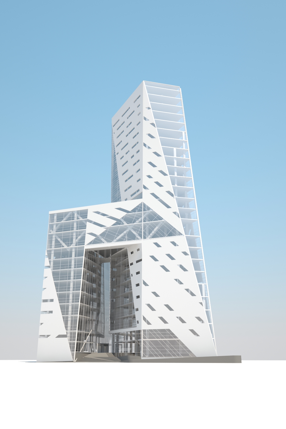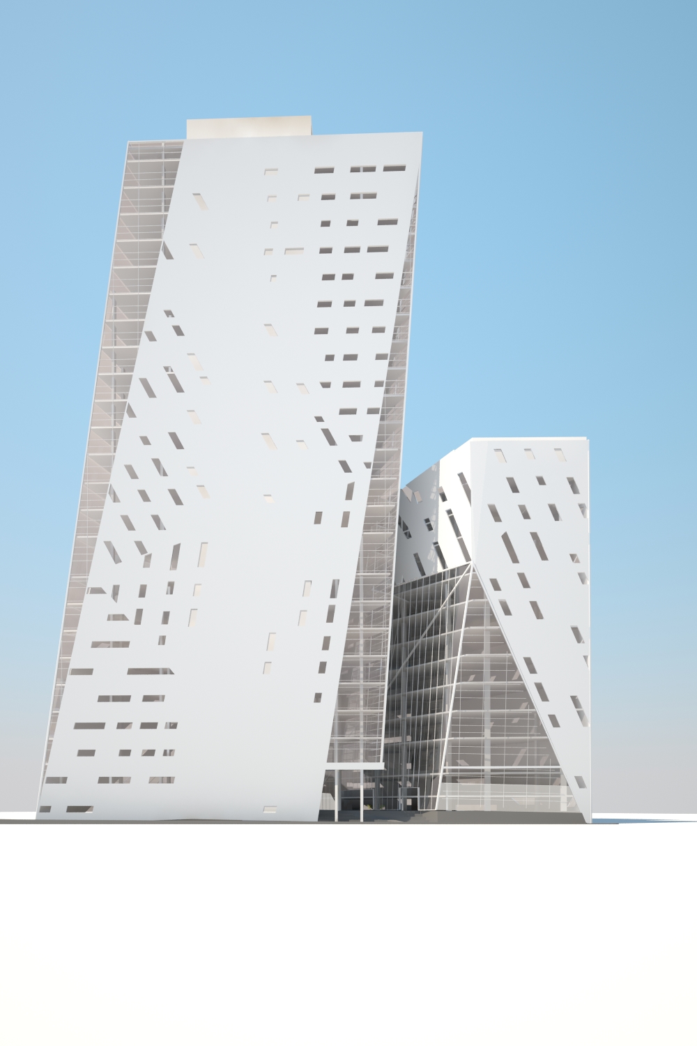 El proyecto propone articular los diferentes usos requeridos por el programa arquitectónico a través de espacios públicos en Planta Baja y en un SkyLobby que conecta las 3 partes del edificio a partir del nivel 8 al 10.