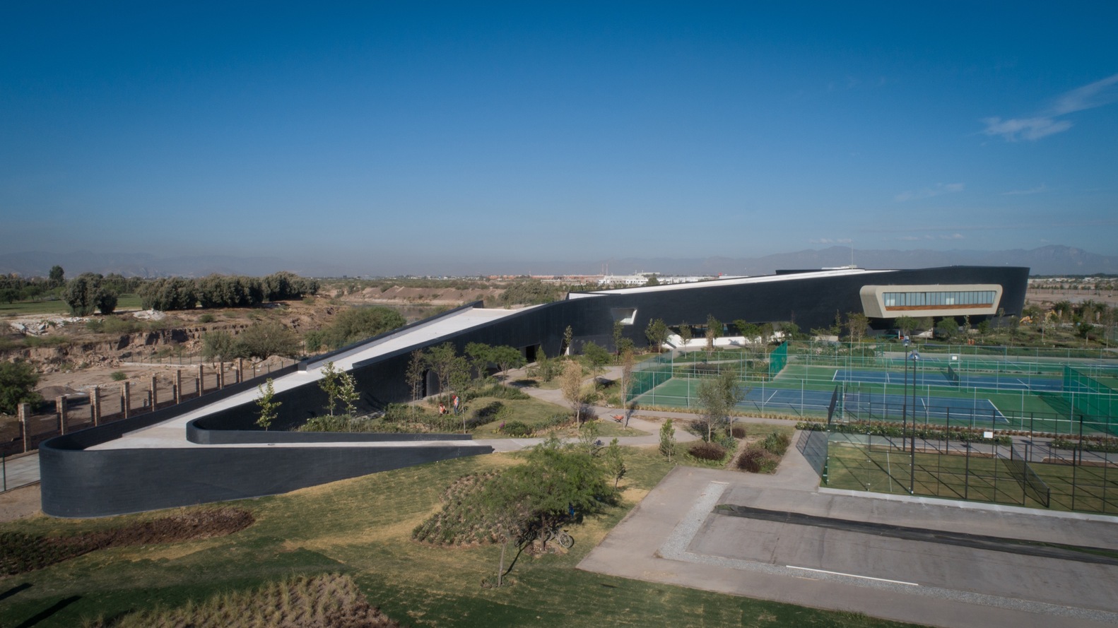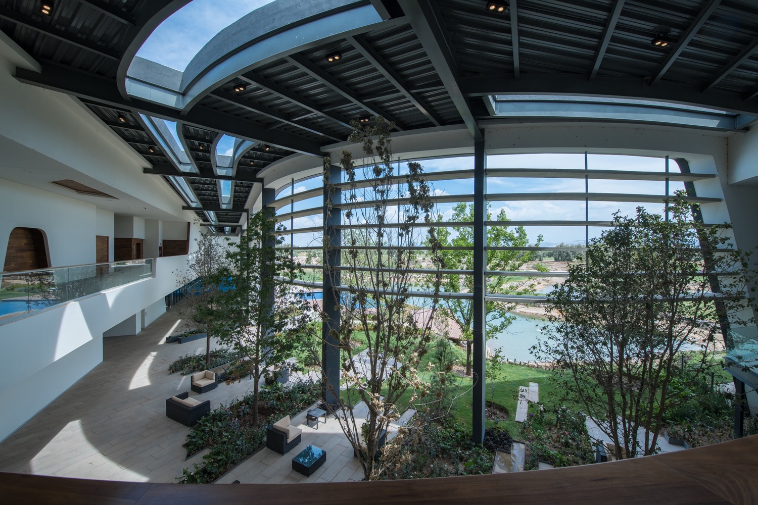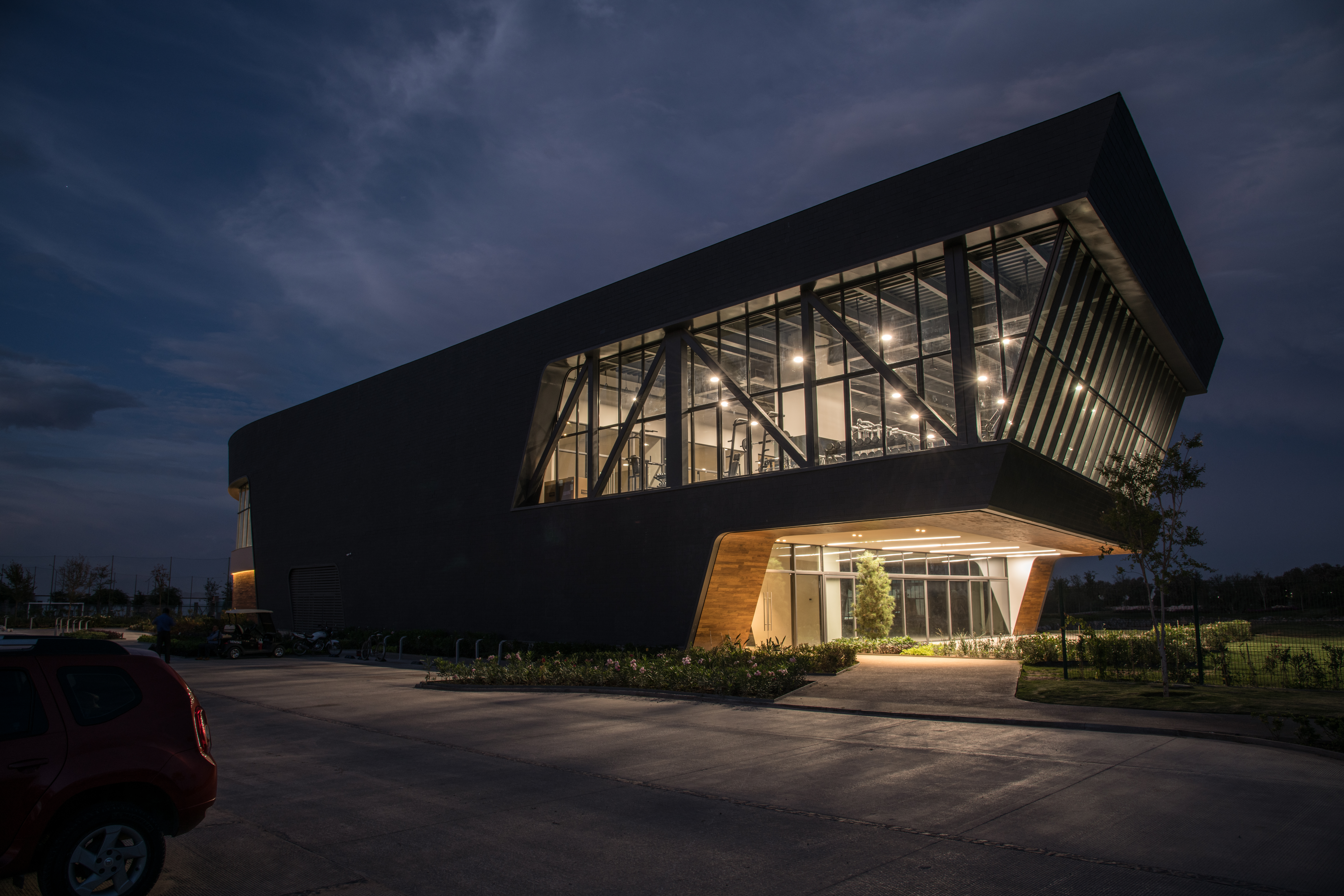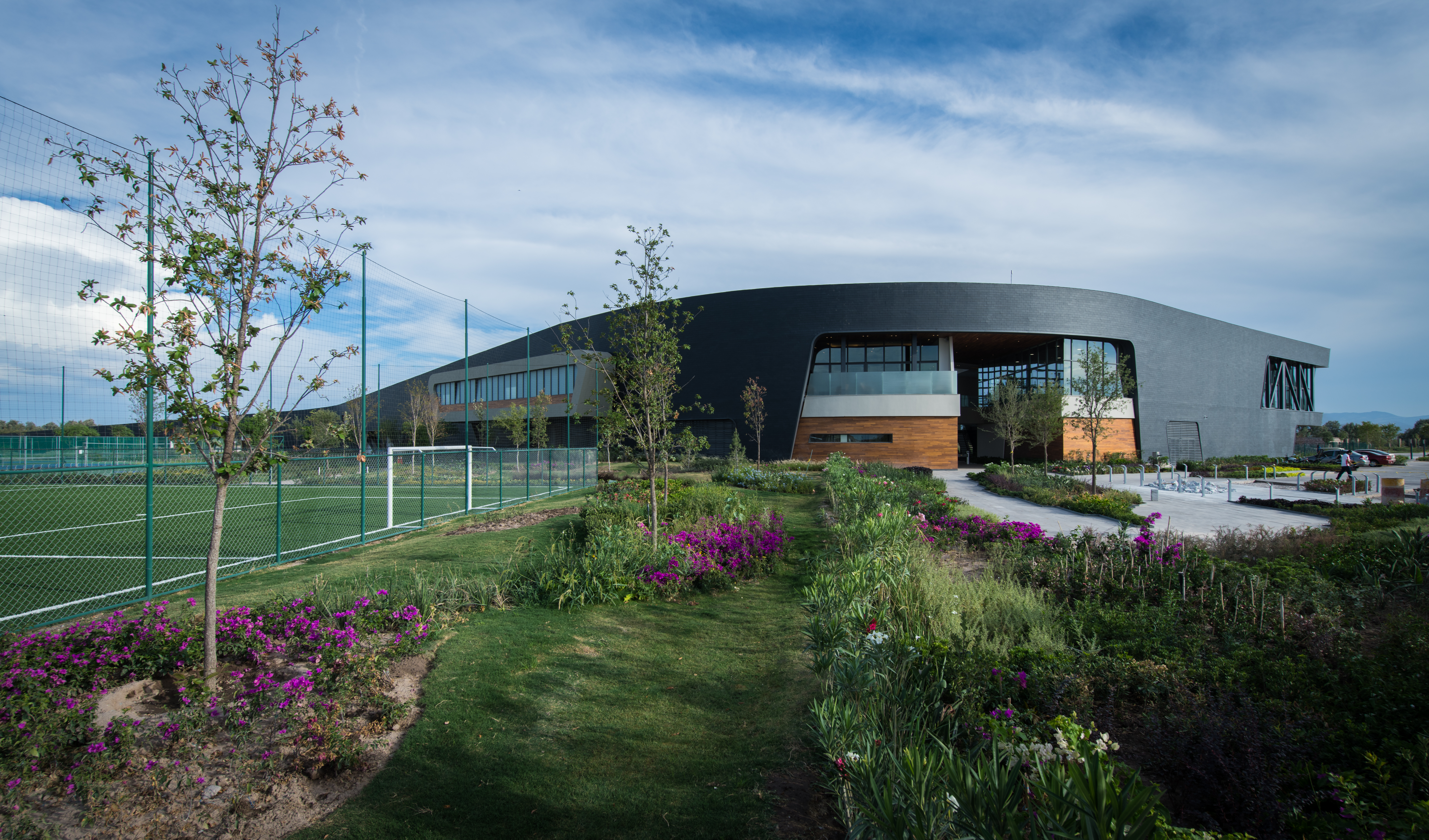 Desde este gran espacio arbolado se accede a las zonas administrativas y de ventas, así como a la alberca techada. Asimismo, un eje de circulación atraviesa el espacio para vincularlo con la zona de albercas exteriores hacia el sur, y las canchas deportivas hacia el norte. Los salones de eventos se plantearon como una unidad de programa independiente, con su propio acceso, por lo cual a estos se llega a bajo un gran volado de 13 m que actúa como una gran marquesina de entrada y terraza de eventos. Las áreas de servicio se alojan en la parte más delgada del cuerpo del edificio hacia el oriente.