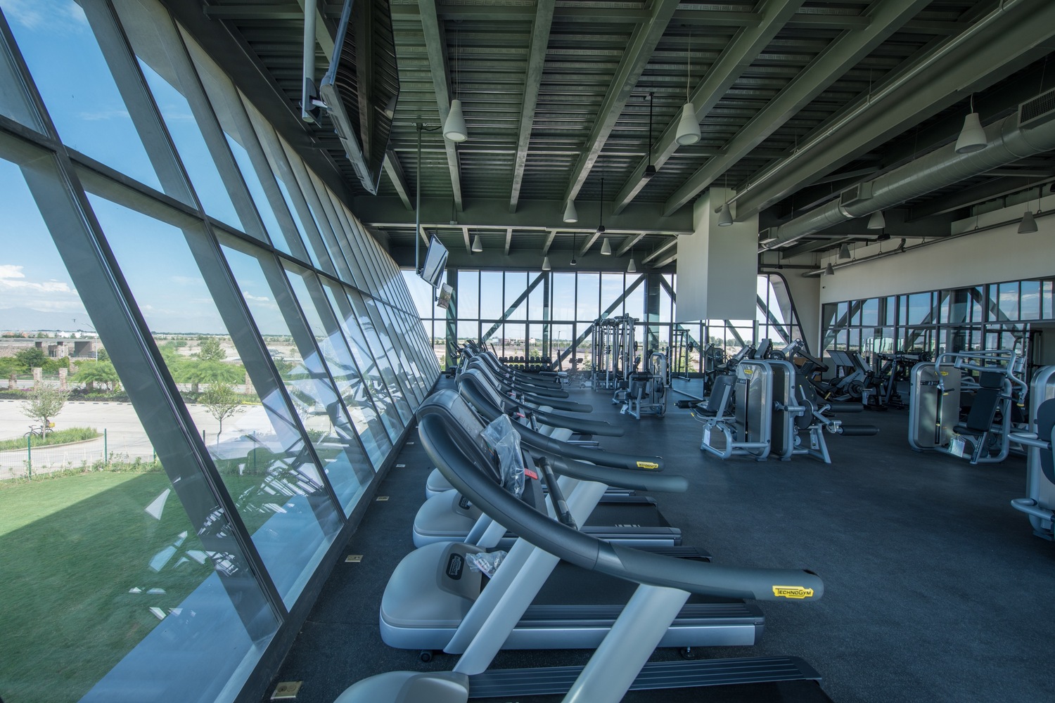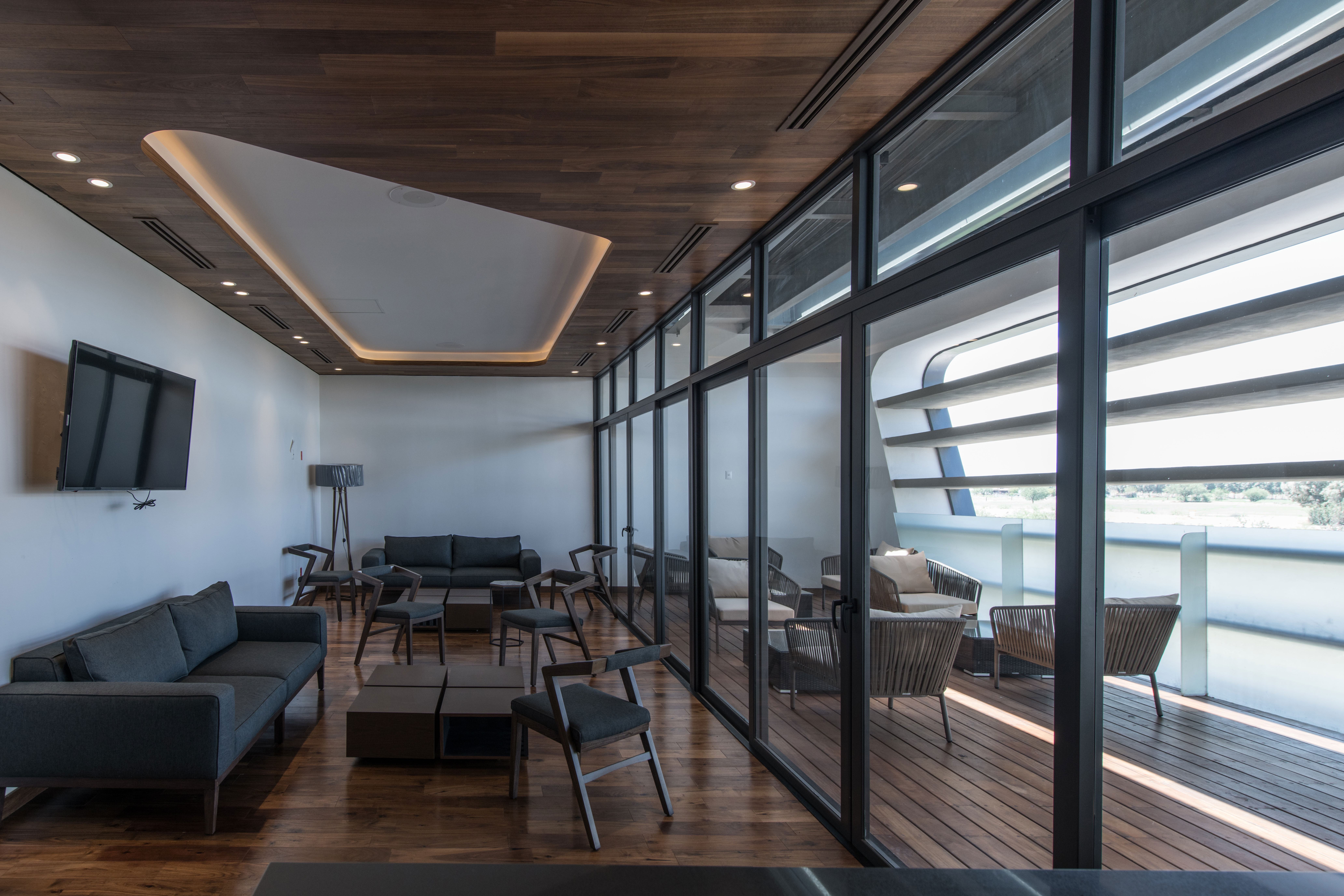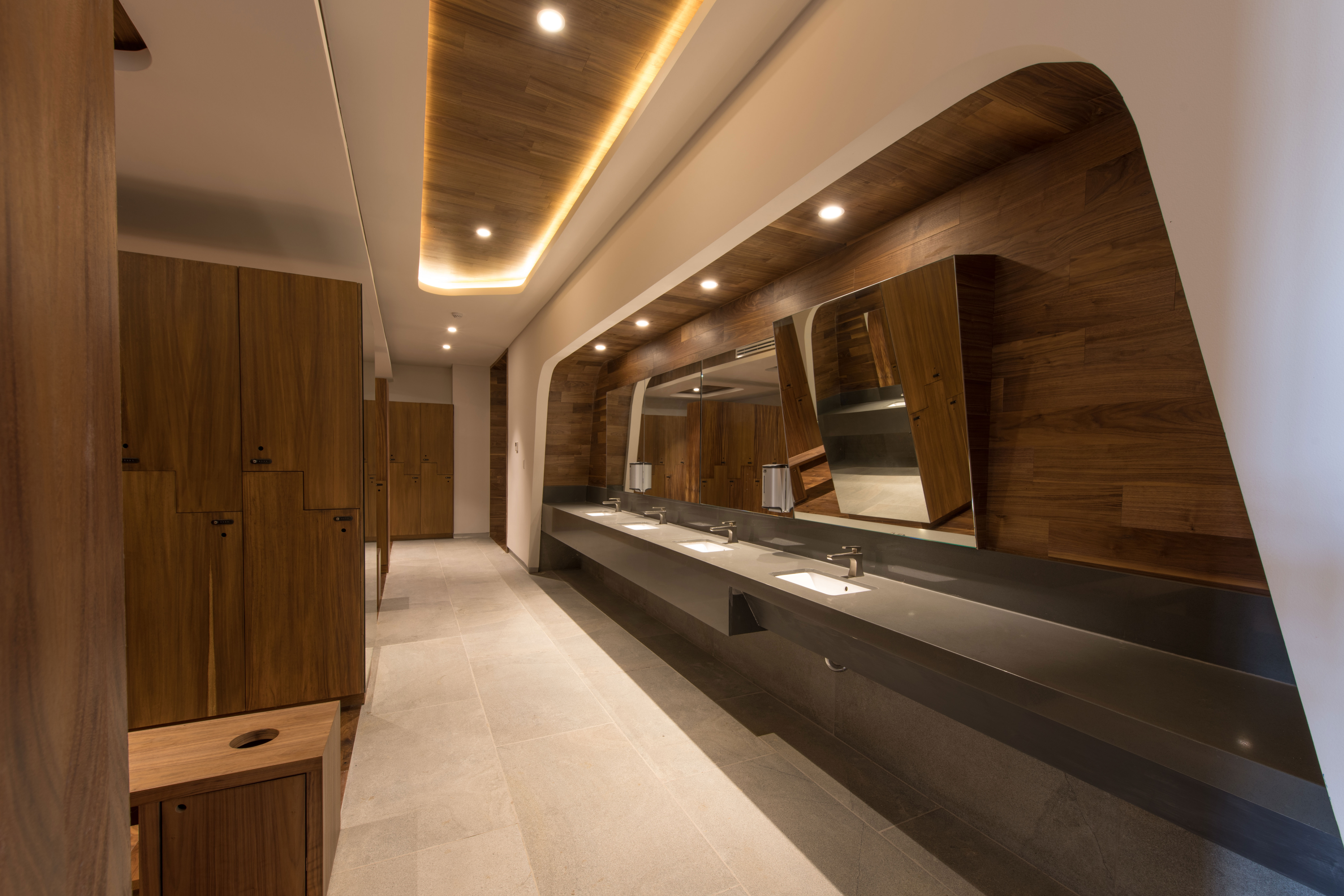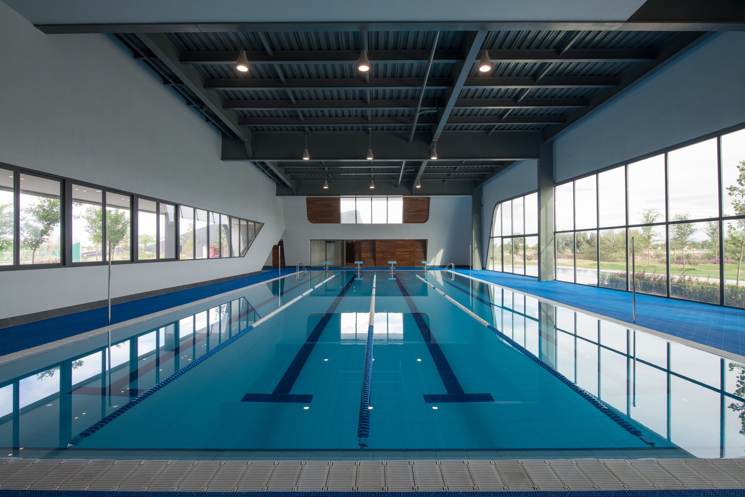 Desde este gran espacio arbolado se accede a las zonas administrativas y de ventas, así como a la alberca techada. Asimismo, un eje de circulación atraviesa el espacio para vincularlo con la zona de albercas exteriores hacia el sur, y las canchas deportivas hacia el norte. Los salones de eventos se plantearon como una unidad de programa independiente, con su propio acceso, por lo cual a estos se llega a bajo un gran volado de 13 m que actúa como una gran marquesina de entrada y terraza de eventos. Las áreas de servicio se alojan en la parte más delgada del cuerpo del edificio hacia el oriente.