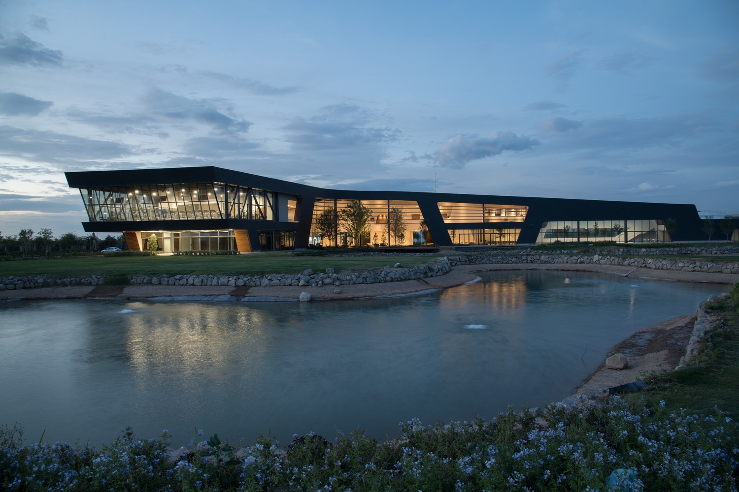 El edificio se curvea respondiendo a orientaciones óptimas y vientos dominantes para alojar espacios de encuentro que sean frescos dadas las condiciones climáticas del sitio. El programa arquitectónico está distribuido en dos plantas accesibles desde el gran espacio continuo que conforma el lobby y el snack en doble altura, protegido por louvers y árboles en su interior y con vistas a los lagos que colindan con el edificio al sur.