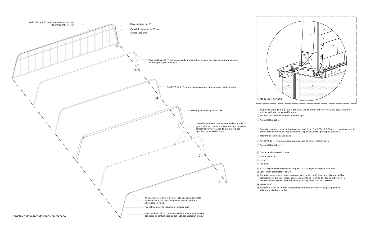 La fachada del proyecto está recubierta en pizarra española en lajas de 23 cm x 32 cm. Éstas lajas actúan como las escamas de una serpiente absorbiendo las superficies con doble curvatura que genera el volumen del edificio. Al ser una fachada ventilada dichas lajas actúan como aislante de la temperatura hacia el interior del edificio. La fachada norte del edificio se curvea hacia el oriente y tiene una gran apertura que marca el acceso principal al edificio. Y la fachada sur del edificio tiene un gran arco con louvers que protegen de los asoleamientos hacia el sur del edificio