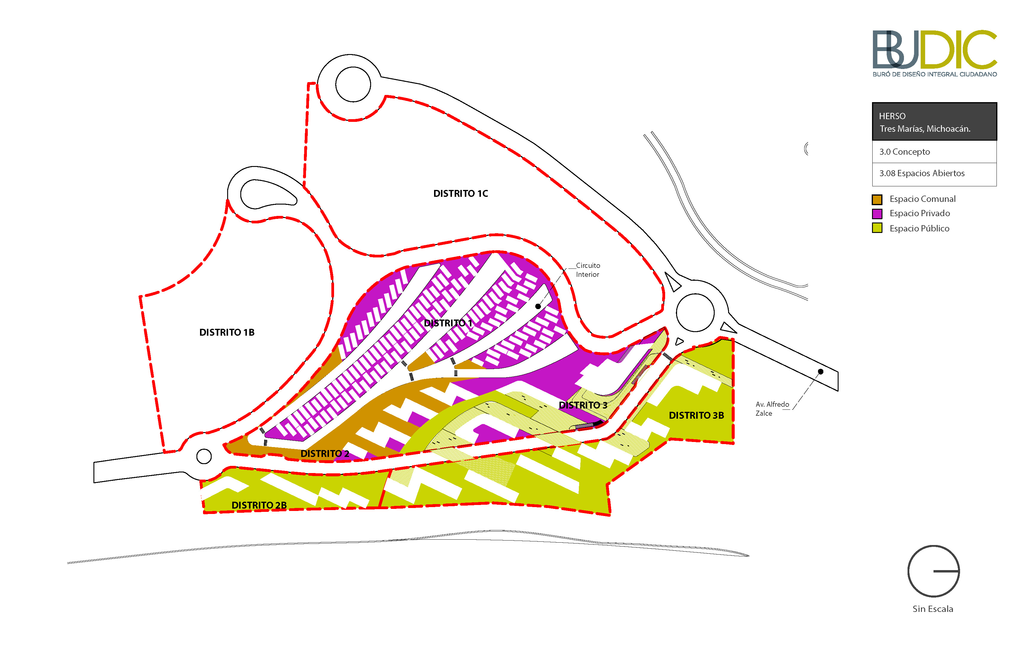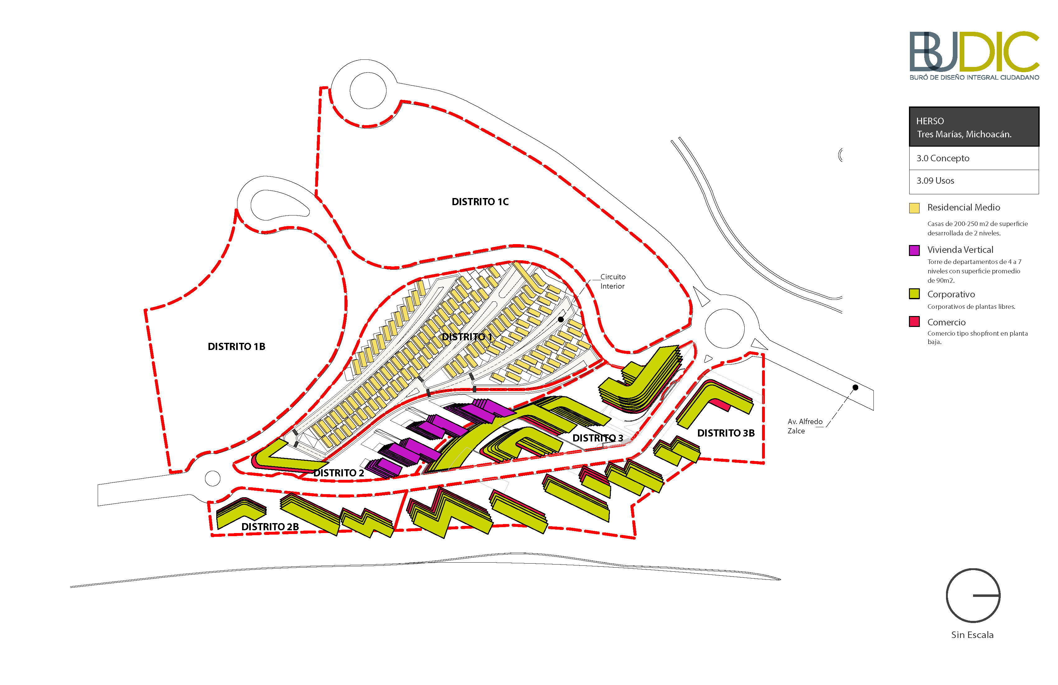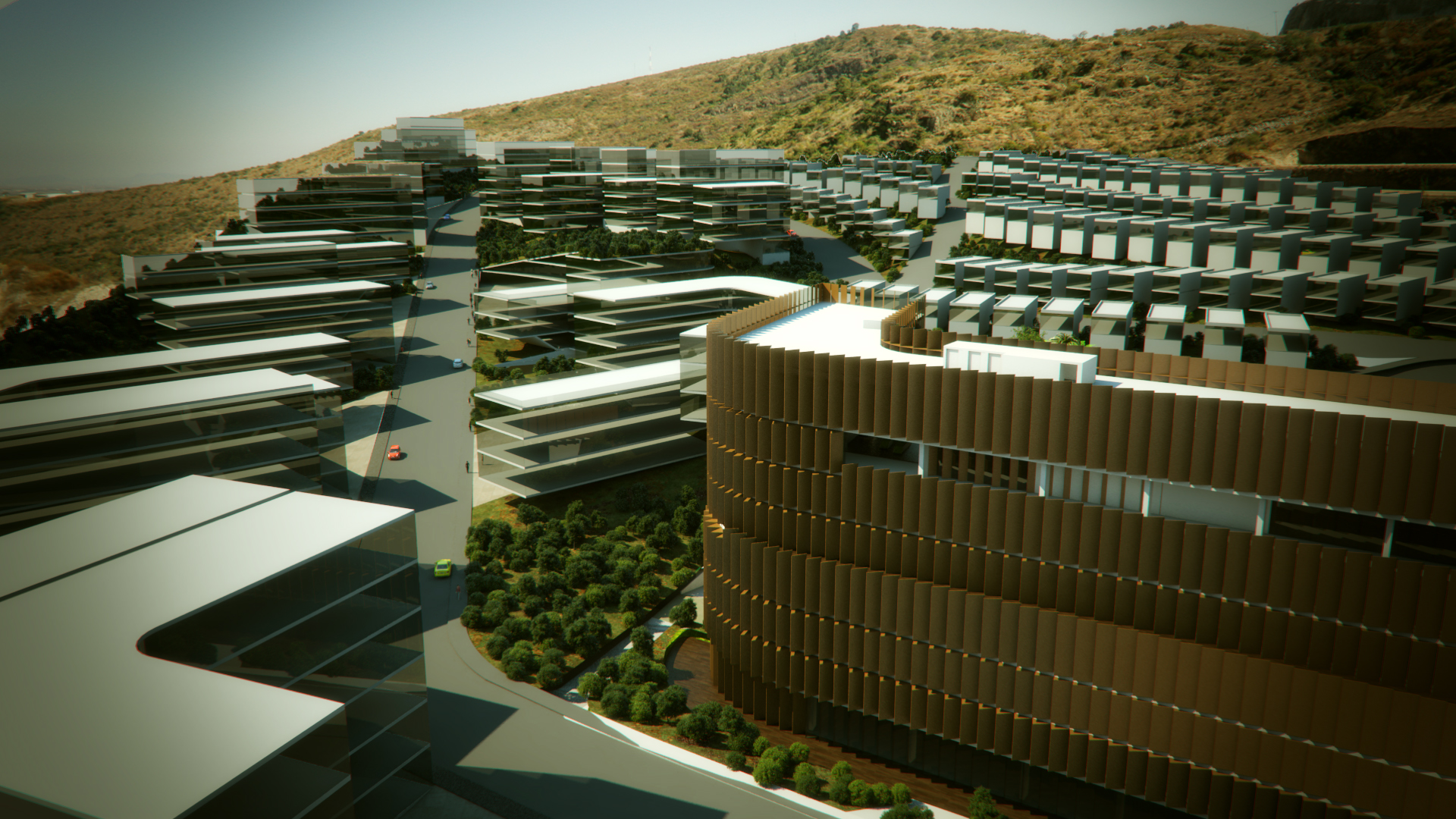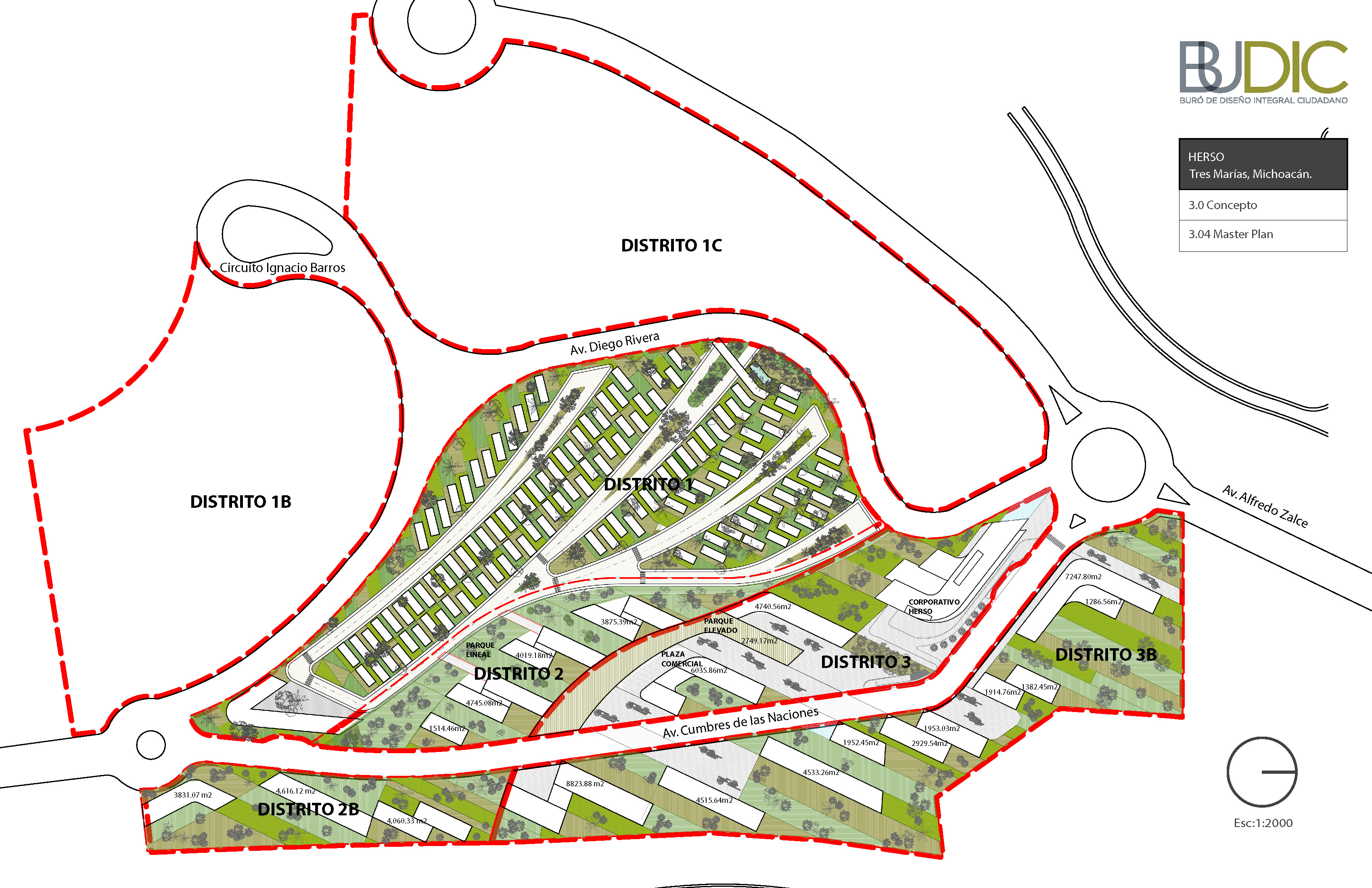 La generación formal del Masterplan parte de una operación doble, aparentemente opuesta: Integración y diferenciación. Esta operación simultánea por la cual se logran espacios continuos, pero con identidad propia es la clave para “hacer ciudad.” El proceso de diseño parte de una serie de acciones que buscan generar una visión global de proyecto: topografía, retícula y concepto de espacio abierto; y continúa con acciones específicas de diferenciación: distritos, tipologías distritales y espacio público