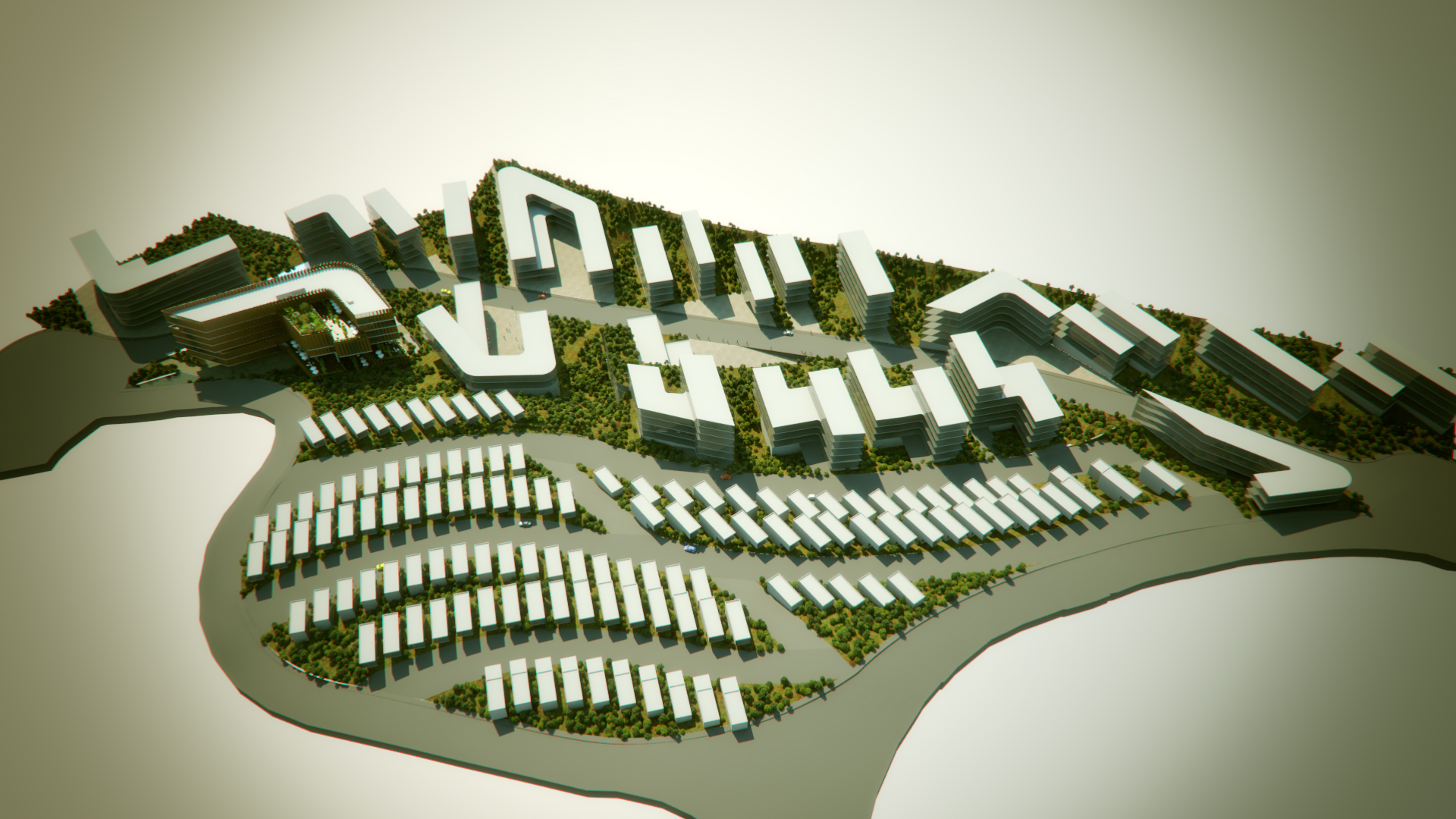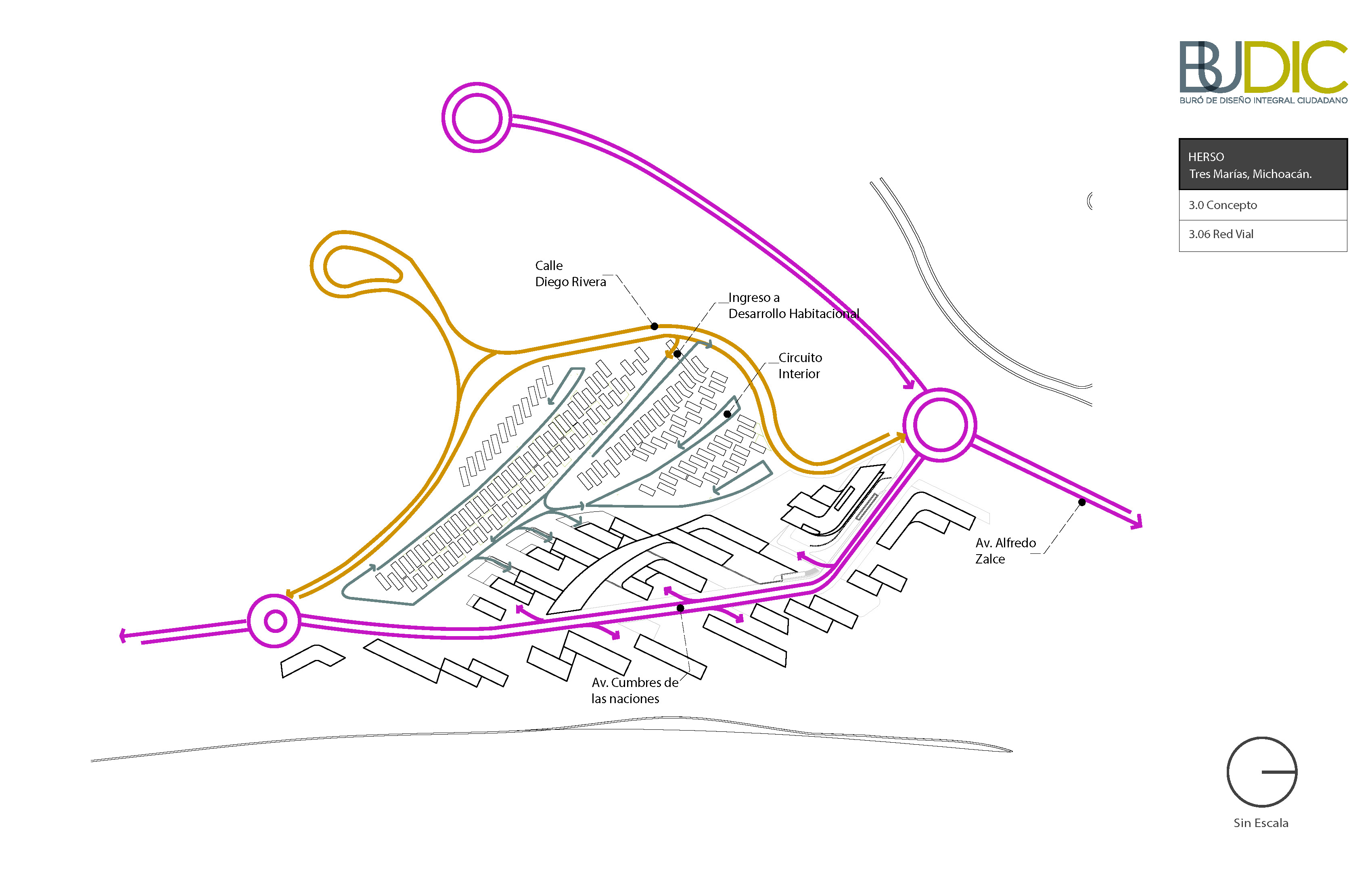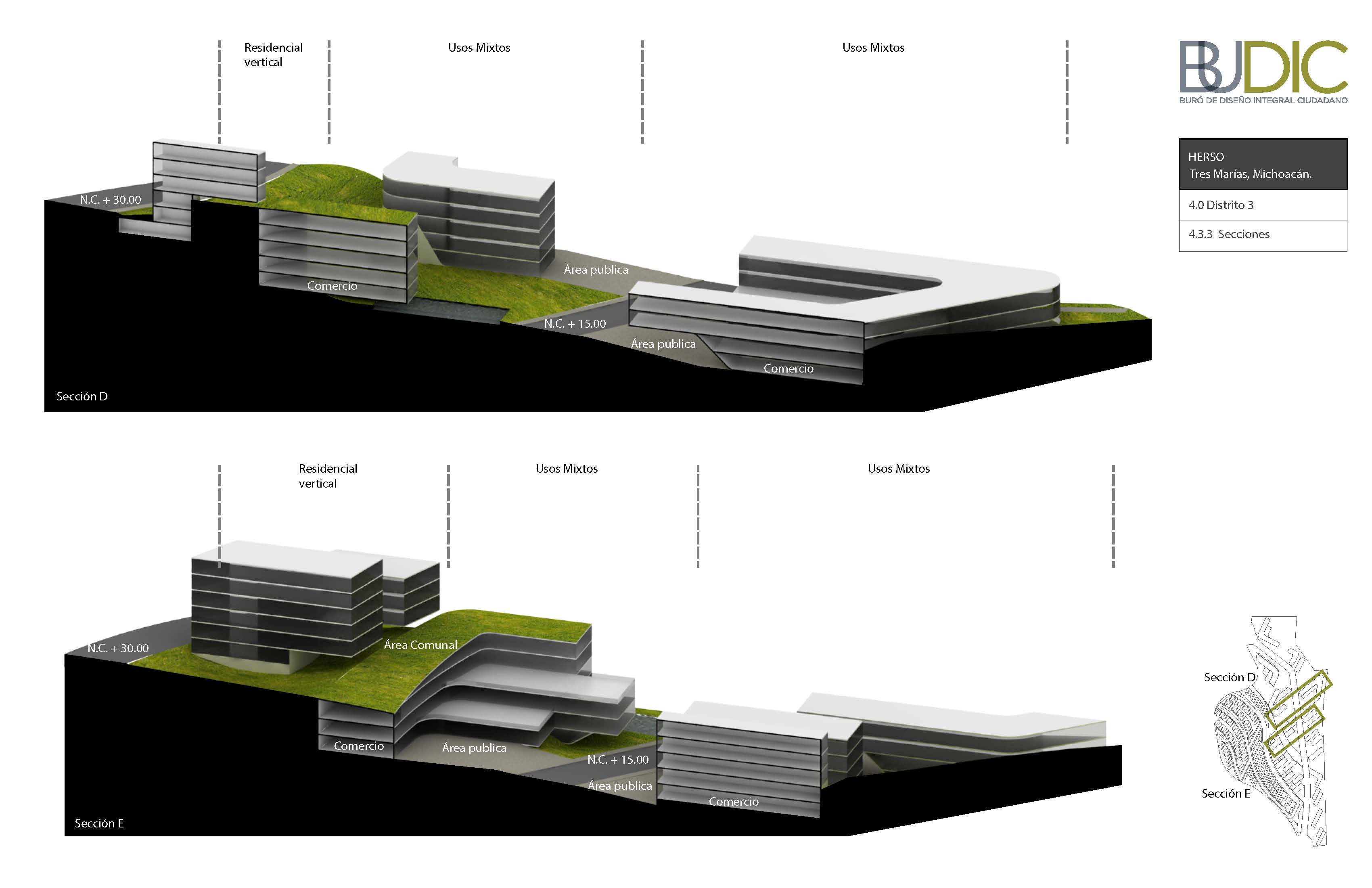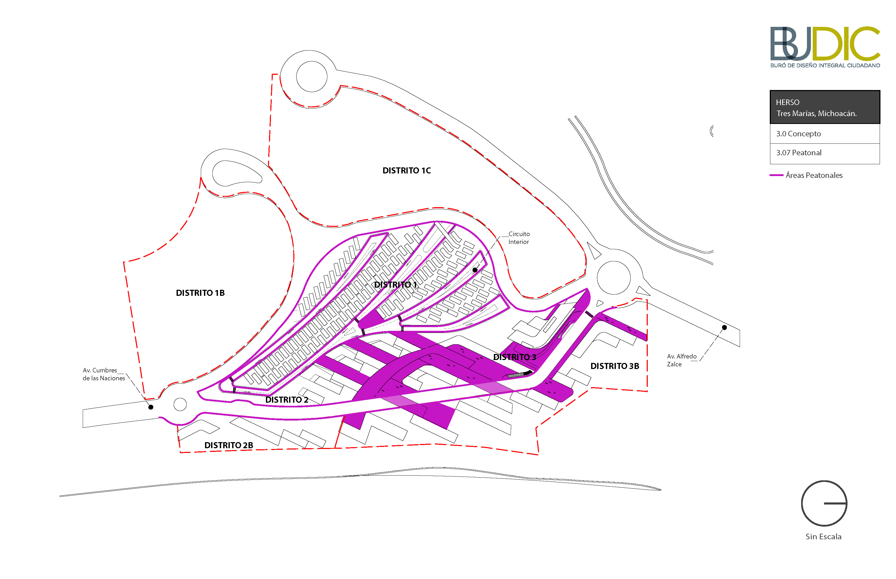 La generación formal del Masterplan parte de una operación doble, aparentemente opuesta: Integración y diferenciación. Esta operación simultánea por la cual se logran espacios continuos, pero con identidad propia es la clave para “hacer ciudad.” El proceso de diseño parte de una serie de acciones que buscan generar una visión global de proyecto: topografía, retícula y concepto de espacio abierto; y continúa con acciones específicas de diferenciación: distritos, tipologías distritales y espacio público